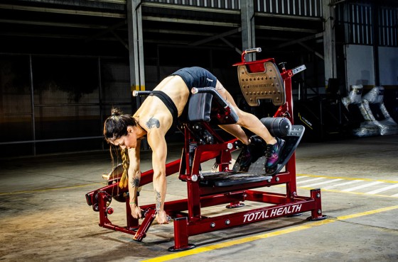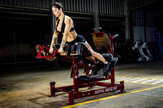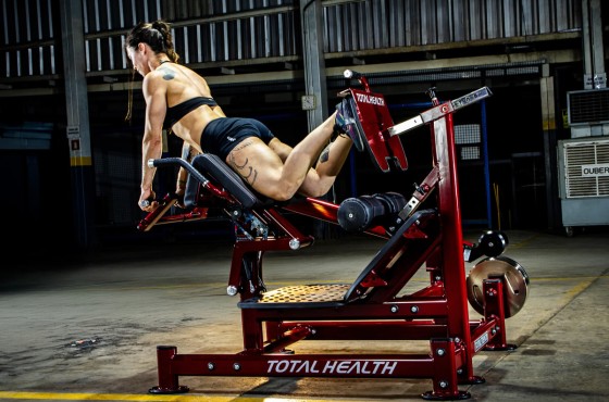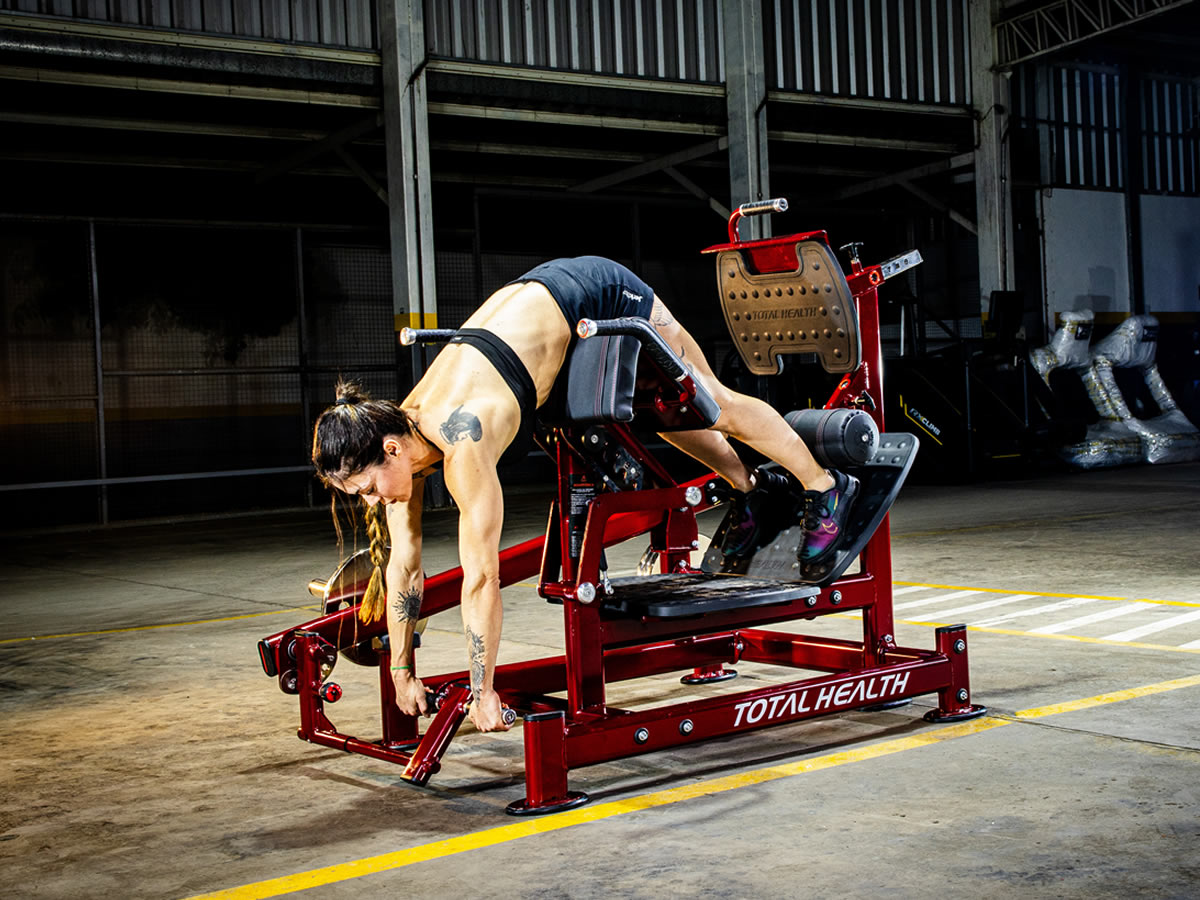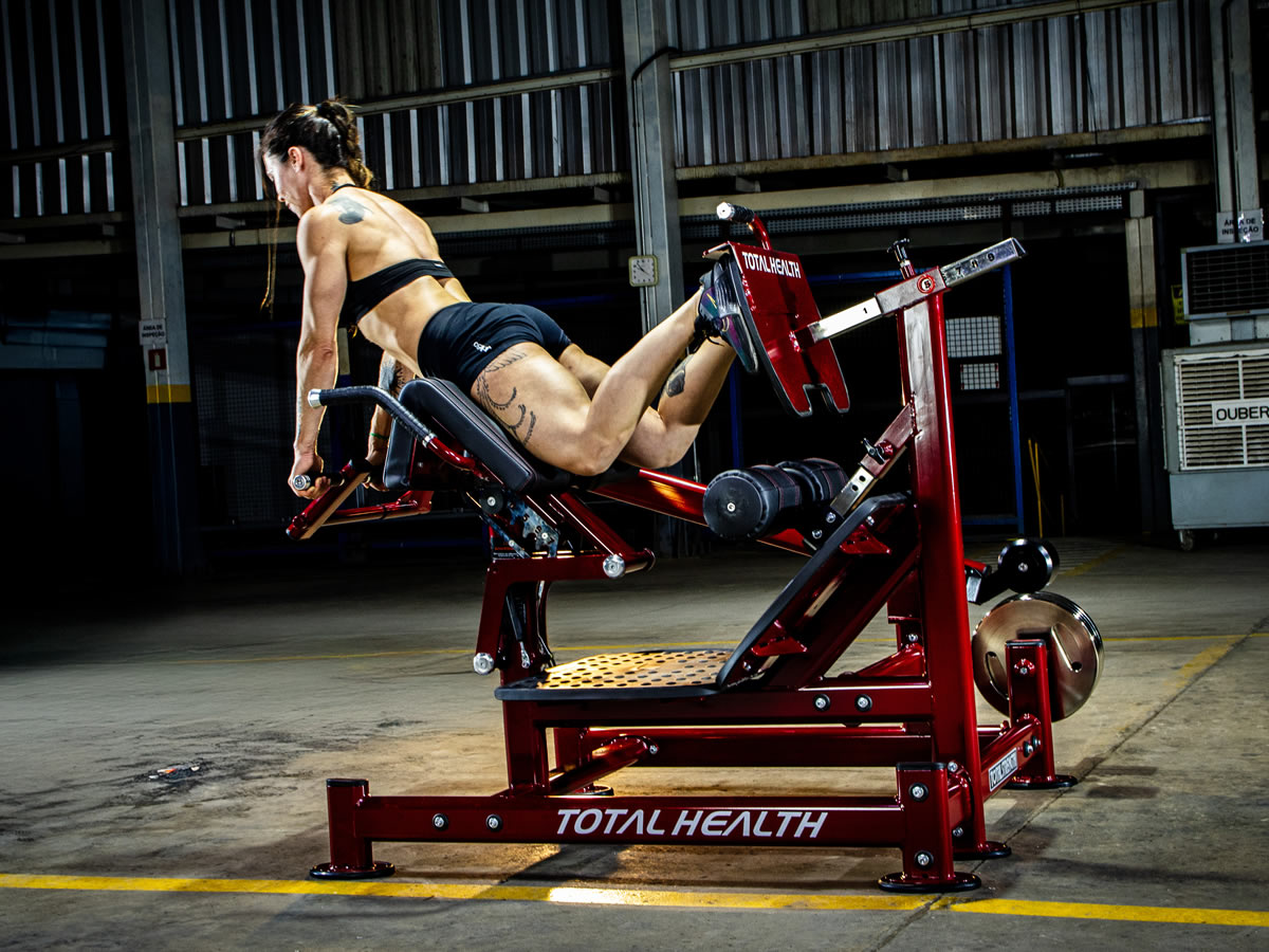 O Dual 45 Hip Extension da Total Health é o equipamento com movimento a 45° que oferece duas posições de treino: extensão de perna tradicional com rolos de apoio e uma variação com joelho flexionado usando plataforma, maximizando o isolamento dos glúteos.